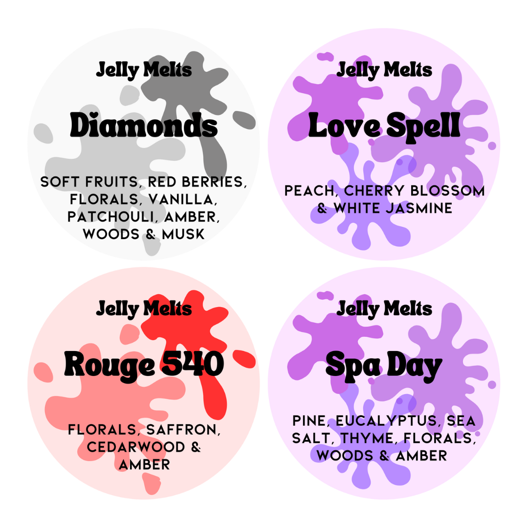 This is our Valentines Bundle, the perfect gift for your loved one. It includes 4 standard sized Jelly Melts, that's up to 120 hours of burn time!! The scents included are: Diamonds, Love Spell, Rouge 540 and Spa Day.