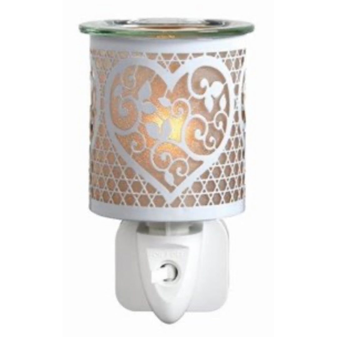 A beautiful heart design white and gold silhouette plug in which will create a shimmery glow.